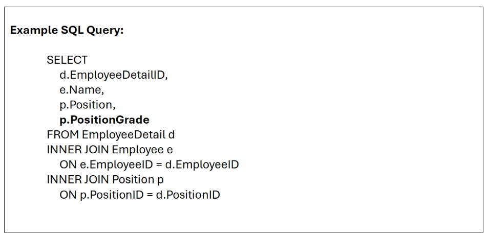 This query reconstructs the business view by joining the employee record to the employee’s detail row and position record, including the addition of the theoretical PositionGrade column: