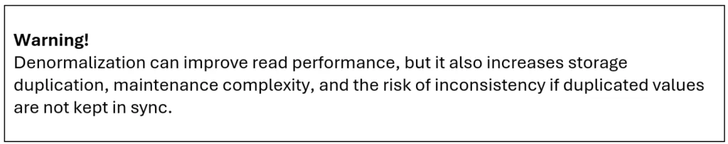 For read-heavy use cases such as reports, dashboards, or repeated summary queries, it may be practical to denormalize selected data for performance.