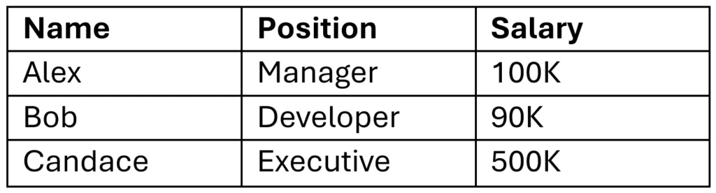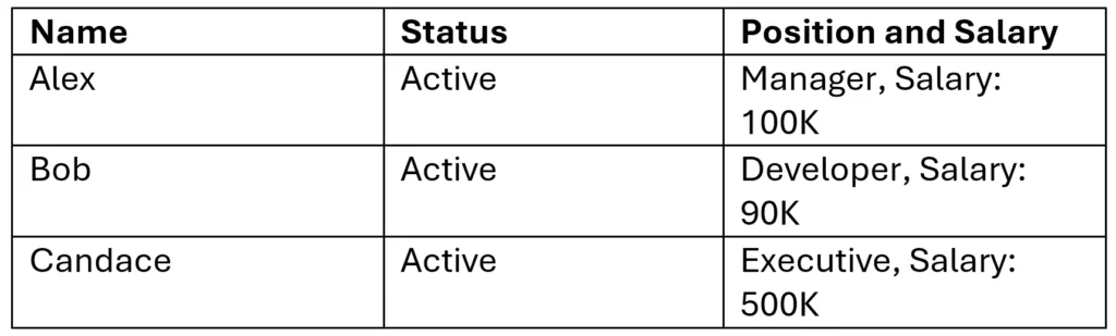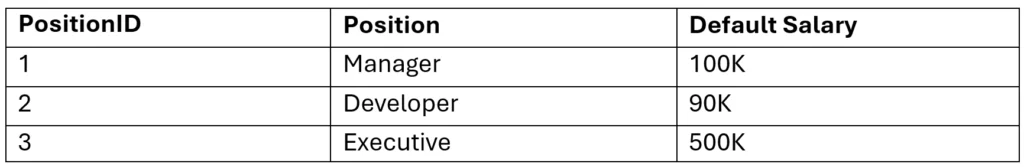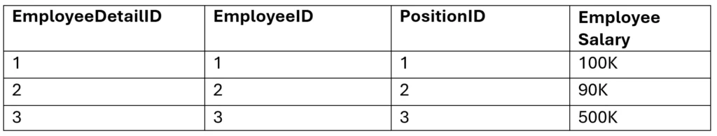 This design also separates position data from employee-specific salary data. If Alex receives a raise, only the Employee Detail table needs to be updated. That change does not affect other employees with the same position.